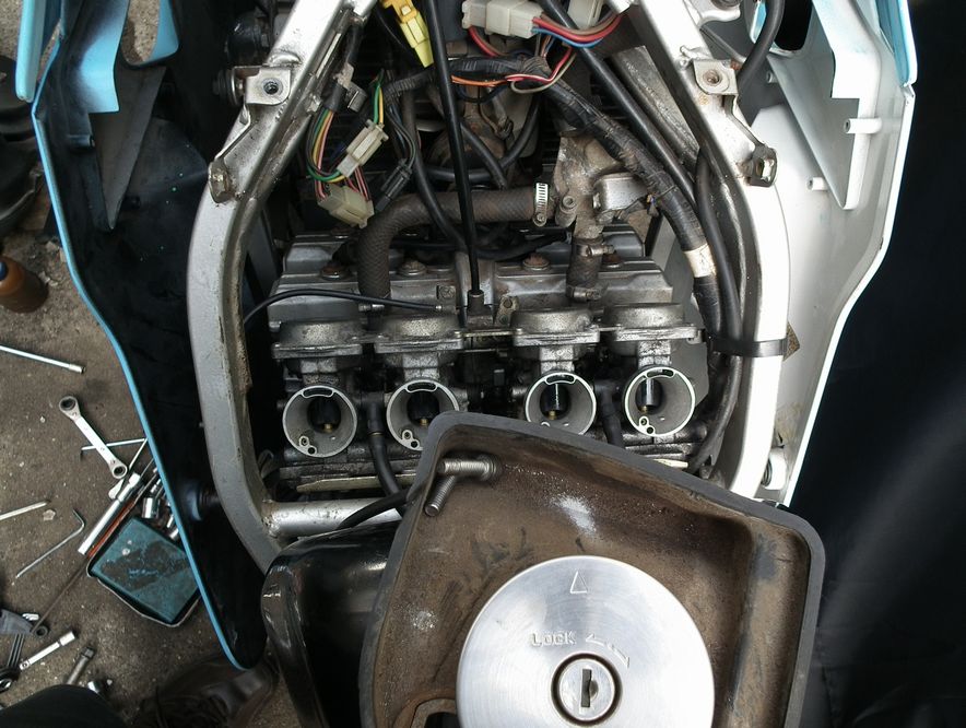 タイヤバルブの破壊からもまたしばらく時間がたって,もう季節は夏.ずいぶん気候も変わったというのに未だにFZR250はしばらく乗るとアイドリングが上がってくる現象が消えずにいました.まあ2000回転を超えることはないので,渋滞にハマったりしない限りあまり気になりませんし,所詮エンジンブレーキにも期待していませんので,長期放置してきたということになります.これはひとえに策がない上にタンクの取り外しだけで大変な量のねじや部品を外さなければならないからに他ありません.そうはいってもやっぱり気持ち悪いわけで,もう一度キャブレターを見てみることにしました.