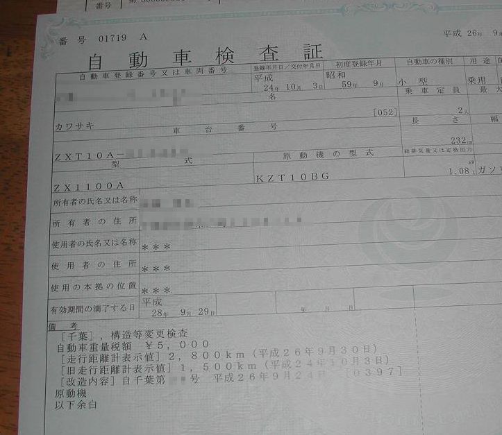 あとは通常の車検と同じく、車検証を受け取っておしまい。シールを貼って11時には運輸支局を後にすることができたので、時間にすると普段より30分ぐらい長めに時間を要した感じです。帰路につき、違法改造ではないGPz1100の走りを堪能します。といっても何にも変わってはいないんですが。一応最大出力120psだと思っていたエンジンが実は100psだったというオチはついてしまいましたが、実際走っている感じではまったくそんな出力域を使用しないので一切損した気持ちとかもありません。そういえば、今回のこれで、社名のカワサキが”カワサキ改”とかになるかと思っていたのですが、そんなことはなく、ナンバーも今までの物がそのまんまです。
