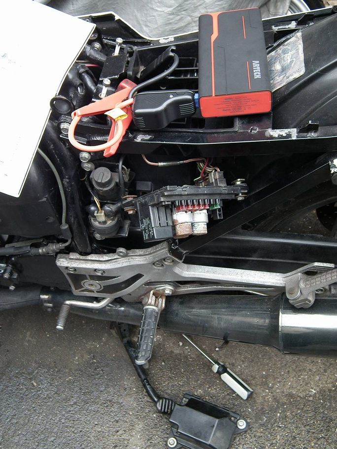 今回は是が非でも火入れということで,電装の確認からやっていきましょう.ひとまずジャンプスターターを使って電装を確認します.というのもこの種車のハーネスがライトのON/OFF増設の改造をされているからでして,しかもメーターも改造品なのでこれがちゃんとできているかを確認したいということで,かなり電装系には不安があったりするわけなのです.