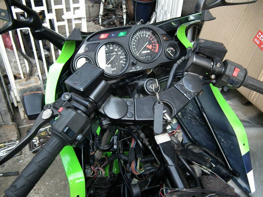 そして車体に取り付け,ヒューズも新たにしてジャンプスターターでイグニッションをON.すると今度はニュートラルランプ,オイル警告ランプが点灯してくれました.もちろんヒューズも切れていません.う〜ん,これでようやっと第一関門突破かな?