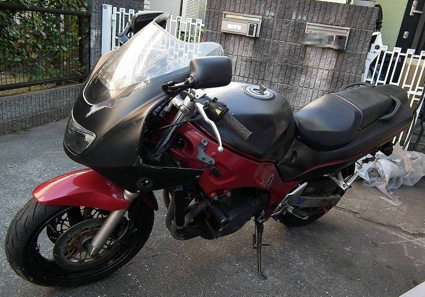 まず,エンジン以外の状況としてはフロントカウルとスクリーンには多少深い擦り傷のようなものがあり,補修が必要です.これは再塗装を最初っから計画していますのでそんなダメージではありません.タイヤは溝ありのまだまだ使えるものを前後とも履いていますが,フォークはオイル漏れしています.ハンドル周りはレバーやハンドルスイッチも含め欠品はほとんどなく,ミラーまでちゃんと左右ついていますし,鍵はタンクのみ異なるので2本ついて来ていますので,問題ありません.そんな感じなのでかなりぱっと見は期待が持てる機体であるといえそうです.