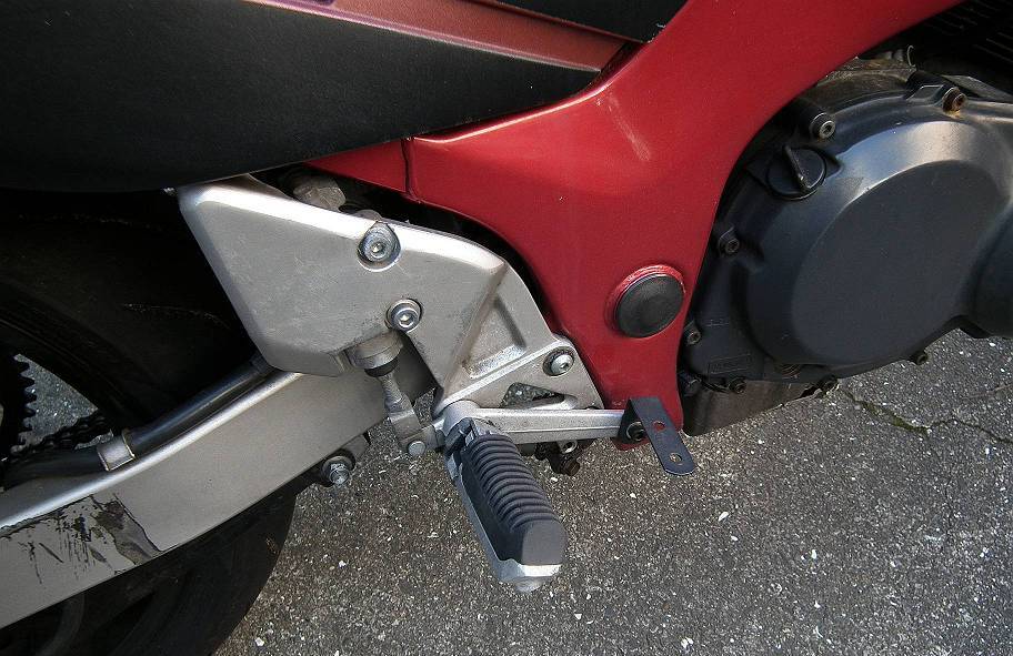 エンジン以外で最も違和感を感じるのはこのブレーキペダルです.ブレーキペダルがこんなふにゃふにゃではコントロールができないだろうと見ただけで心配になってきますが,転倒して折れてしまったのを無理やり修正してこんなことをやってしまったんでしょうね.あんまり同調したくない感じです.ちなみにマフラーはエキパイまでは着いているのですがサイレンサーはありません.ここらへんは比較的安価に調達できそうです.