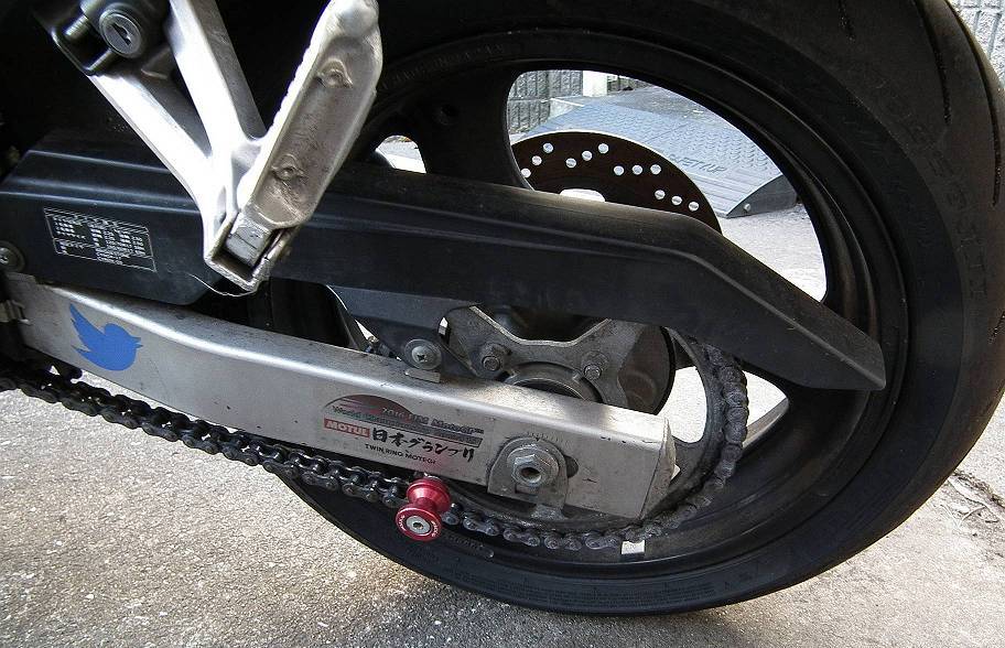 チェーンやスプロケットも交換の必要はなさそうですが,どうもスイングアームにツイッターやなんか4輪イベントのステッカーが野放図に貼られていたり,リアスタンドのフォロアーが片側だけついていたりします.ちなみにすでに取り外そうとしてネジの頭をなめてしまった後のようで,これは頭を飛ばして除去するしかなさそうですね.