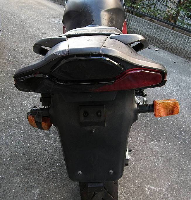 特徴のあるテールランプですがなぜか黒いカッティングシート?のようなものが貼られています.この点から考えて,この車両は恐らく公道以外での使用メインであった時期があったのではと推測しています.テールカウルにも一部削れはありますが,テールランプの破損やフェンダーの曲がりなどはないのでリア周りも比較的健常体であるといえるでしょう.