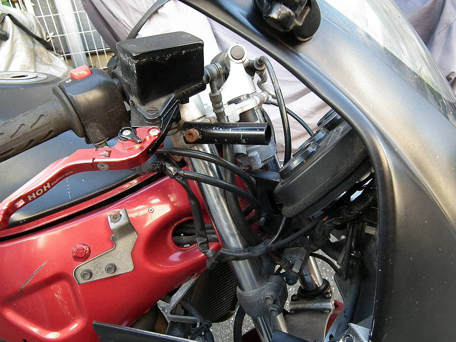 カウルの内側ですが,なぜかトップブリッジをとめているネジにパイプのようなものが共締めされています.根元はかなり潰れているので,恐らくトップブリッジの締結力はかなり低下していると思われますので,走行安定性にも問題があったのではと心配してしまいます.ブレーキレバーは社外の可倒式のものがついていますが,ここらへんはそのまんまでもいいかなと思います.ブレーキの利きは前後ともOKそうですし,ブレーキホースの硬化もまだ目立った変化はないようです.ブレーキ関係はそのままで行けそうですね.メーターもちゃんと後期型のものが付いていて,破損などなくそのまま使えそうです.
