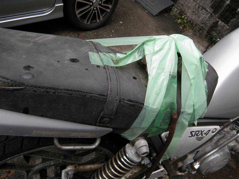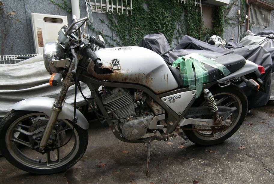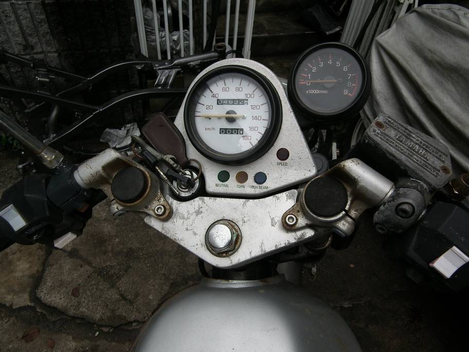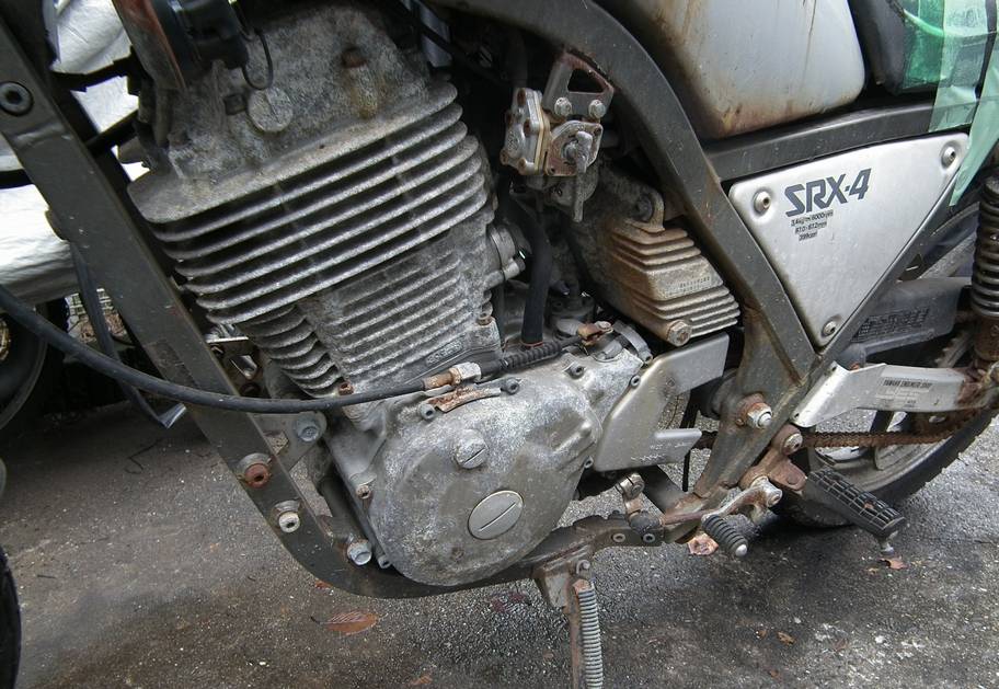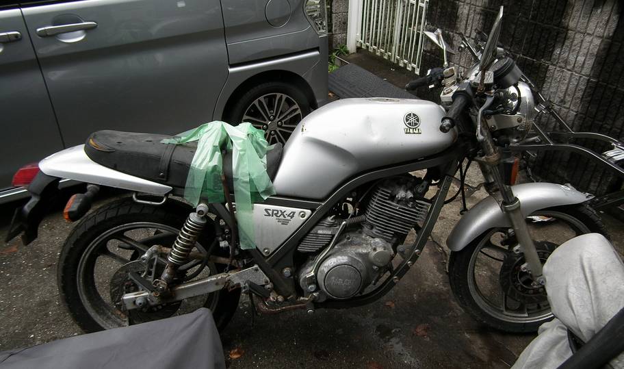 右サイドは,タンクが破れていないので,ずいぶん好印象です.フォークインナーの錆もこれまたひどい有様で,流用は確実に不可.幸いにもキックは降りまして,ちゃんと圧縮していそうな音がしています.ちなみにこの車体はキックのみでしてスターターモーターがありません.SRX250Fでは少なくともセル始動ができたんですが,この車体はキックのみなので,結構長年の使用によりフレームのスタンド取り付け部にクラックが入ってしまい廃車というケースがあったようです.