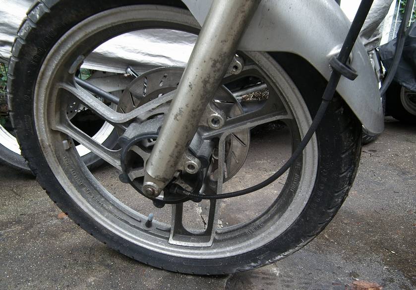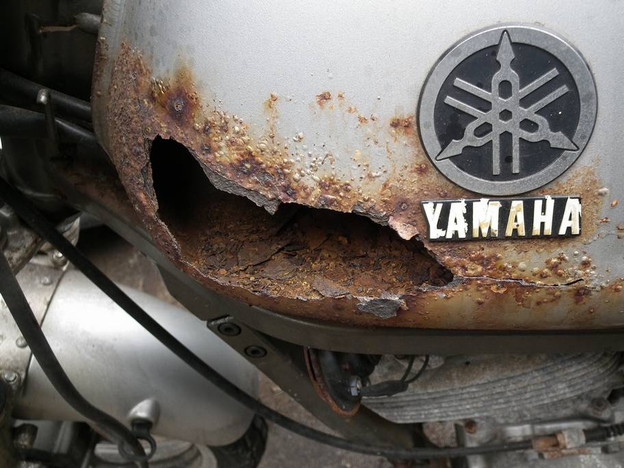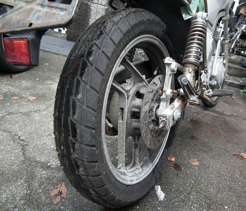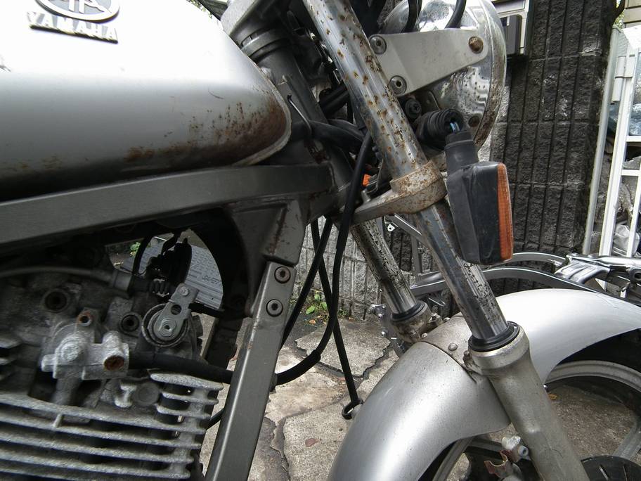 リアタイヤは見ただけでわかる深いヒビが溝に沿って走っています.ホイールの腐食具合もなかなかなもんです.恐らくタイヤはヤマハの工場出荷時についていたものそのまんまなんでしょうね.リアサスはオイル漏れは見た感じありませんが,錆がロッドにも多数あるので使えないでしょう.