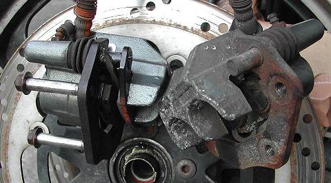 で,次の日の朝にもう片方のキャリパーに着手.同じく木材をかましての作業.作業自体は昨日やった分慣れもあってすぐに終了.しかし一点だけ気になるところが...それはステーのプレートです.ここが錆びていてとても見栄えが悪いのです.したがって昨日作業を終えたもう一方もこのステーを外してひたすら磨きます.錆が落ちたら,ピンの部分をマスキングしてつや消しの黒で塗装.塗装ということになると,養生が必要ですのでステーについては次週に組み込み.それではと,キャリパーのボディを今度は綺麗に清掃しました.といってもこちらは塗装なんかはしないで,アルミ錆が浮いたところをワイヤーブラシでこするだけ.こすったら下地の塗装も結構はがれてしまいましたが,見栄えがそう悪くないので,ここはこのまんま.ということで今週の作業は終了.そんでもってやっぱりここら辺で既にずいぶん長いのでレポートも次週に続くのでありました.