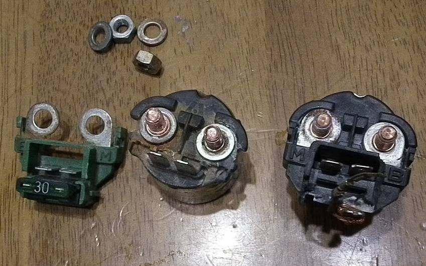 ということで問題はセルスターターリレーということで,ハーネスの全とっかえとかはやらなくてよくなって一安心.で,セルスターターリレーについて入手するわけですが,これですぐにスターターリレー購入に走ったりしないのが私の特質であります.それは手持ちの部品の中に今回使えそうなものの目星をつけていたからです.まず,元の車体についていたスターターリレーは追突の衝撃で破壊されていたため,今の車体につけているスターターリレーは偶然同型のものが電装品のパーツ在庫の中にあったのを流用しています.そしてそれが今回使えないことがわかったわけで,最初っから購入しておけばよかったということになるのですが,それをそのまんま購入に走ってはかんたんに負けを認めるようなモノ.そうならないためにもうひとあがきします.