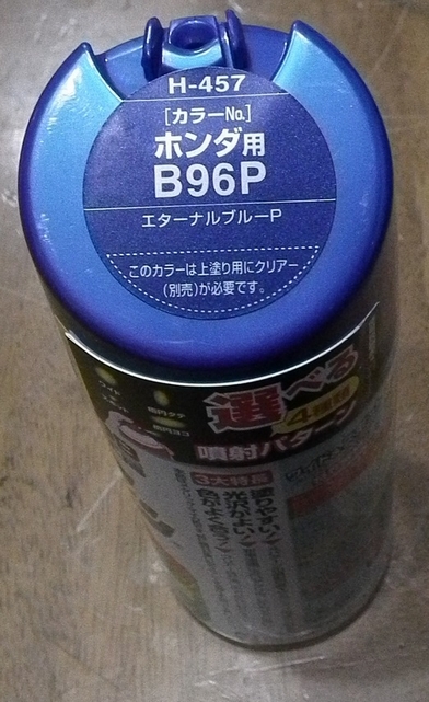 さて,方針は決まったものの,手頃に入手可能なスプレー缶で純正のメタリックオーシャンブルーに近い色はないか探す必要があります.ソフト99の色見本帳とにらめっこして長考してみたのですが,どうも現行セミオーダーでないものでぴったりマッチするものはなさそうです.で,私の直感でこれが一番近いのでは?と決めたのがこれです.ホンダ用B96P.ちょっと色味が濃いような気がするのですが,ここらへんは実際塗ってみないとわかりませんので,ひとまず塗ってみて判断することにします.