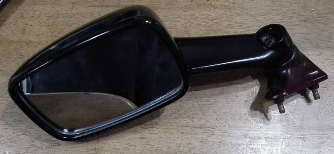 あと,フロントカウルは傷などあるもののASSYでグルニエに置きっぱなしなので,カウルを付ける前に割れてミラーが喪失してしまっている左ミラーをなんとかしなければいけません.これも程度にこだわって,色は気にしなかったので,同じくエンジのメタリックのものを購入してしまいました.なので,こうやって下地処理,マスキングしてから塗装しておきました.ちなみにマウント部分にまだ元の色が残っていますが,これは使用せず元の種車についていたマウント部品を使用しますので問題なし.塗装の時にこの部分をもって塗装すると楽なので,本当にミラーの可動部分のみを塗装したわけなのです.で,フロントカウルが無事車体に取り付きました.
