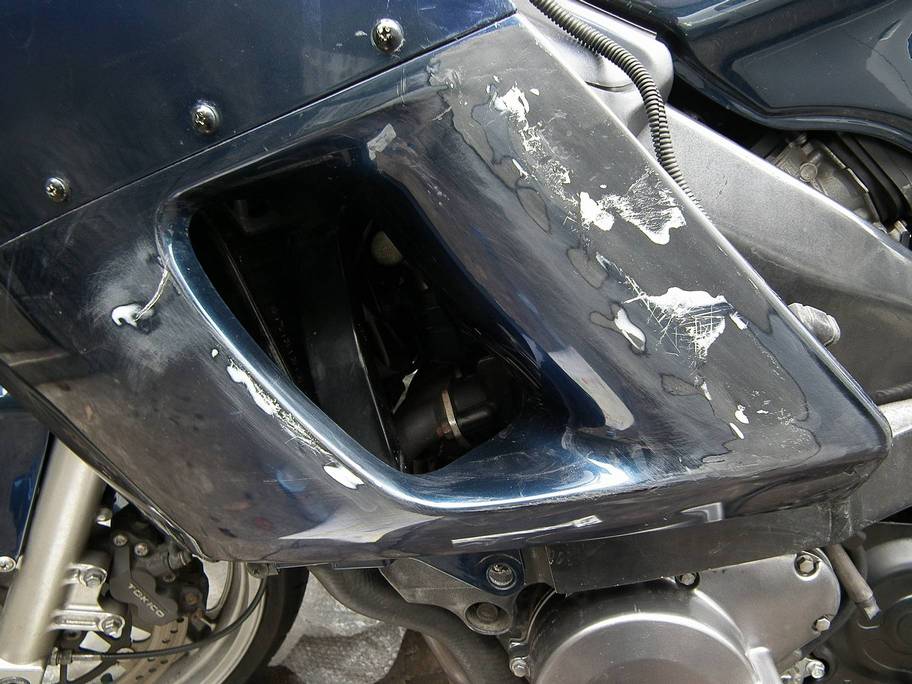 で,フロントカウルASSYといいつつ,サイドカウルも一緒に取り付けたわけですが,特に左サイドカウルにはたくさん傷がついていて割れているところもあります.ここらへんの補修は部品単体に取り外してやっても良かったのですが,面倒なのでフロントカウルも含め車体に取り付けた状態で補修することにしました.こんな感じで傷の盛り上がっているところを除去してパテ埋め,割れているところはエポキシ接着剤などで補修,ペーパーで磨いて整面してから周辺をマスキング塗装といった感じ.これなら室内で補修含めた作業をしないので,家族の冷ややかな目にさらされることもなく気が楽であったりします.