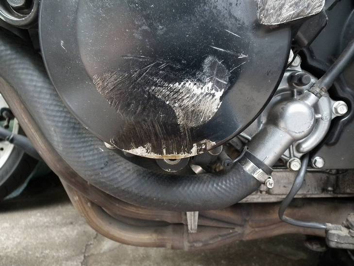 古いオイルは抜けきっているはずなので,帰宅後すぐにオイルをエンジンに注ぎ,しばらくしたところでエンジン下にオイルのしたたりを発見しました.よく見るとオイルはジェネレーターの下から落ちていて,その源流はというとジェネレーターカバーの下が削れて薄くなったところが微妙に割れているようです.これも事故の影響なんでしょうけど,この期に及んでまだ出てくるかって感じです.
