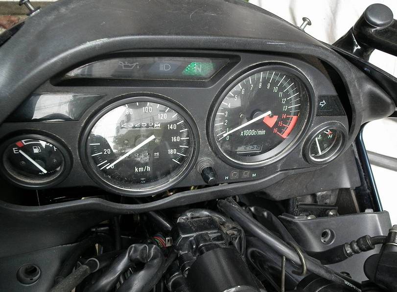 で,ガソリンは元々入っているのですが,流石に時間はたっているので,タンク内に残っているガソリンを一旦抜いて新しく他車からガソリンを抜いて火入れに臨みました.イグニッションをON,チョークを引いてセルボタンを何度か長めに押していたら,ボコボコっと火が入り始め,4000回転ぐらいでエンジンが回り始めました.少し暖気の意味でチョークを引いたまま回し,チョークを戻したところで2000回転ぐらいであったものをアイドリングスクリューで1250回転に合わせ込みます.アイドリング音は非常に静かで,エンジンからの異音も一切ありません.気になっていたマフラーからの排気漏れなどもなく,どうやらこのマフラーで外観さえ気にしなければこのままいけそうですね.アクセルをひねってみると,私の知っている他のカワサキ車に比べてすごくマイルドな回転の上がり方です.最初はちょっとかぶっているのかな?と思っていたのですが,どうもこの車体にはK-TRICがついているので恐らく回転角検知の味付けがマイルドに振られているんでしょう.